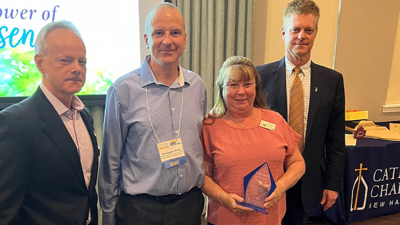 Jill Foote-Gilbert, Administrative Assistant at St. Vincent Nursing & Rehabilitation Center in Berlin, received the In His Footsteps Award, which honors a Catholic Charities NH employee who goes above and beyond in living out the organization’s core values: collaboration, honor, optimism, integrity, compassion, excellence, and service.